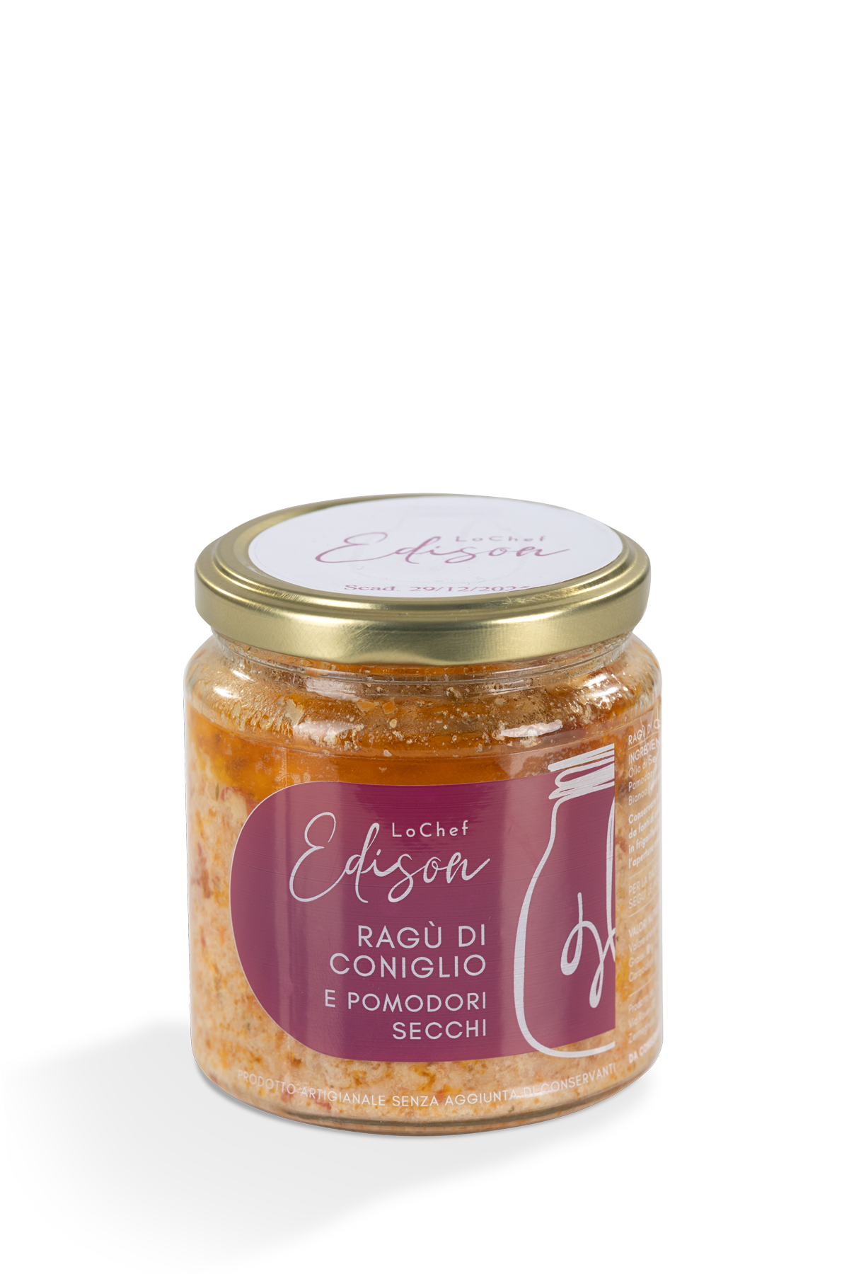 Sughi Ragù di coniglio e pomodori secchi INGREDIENTI: Macinato di Coniglio, Olio EVO, Olio di Semi di Girasole, Polpa Pomodoro, Pomodori Secchi, Sedano, Carote, Cipolla, Vino Bianco (contiene solfiti), Sale, Spezie varie. formato 250g, 500g, 1000 g Torna ai prodotti Prodotti correlati Ragù d’anatra Leggi tutto Ragù di cortile Leggi tutto Ragù classico Leggi tutto Sugo di tastasale e porcini Leggi tutto